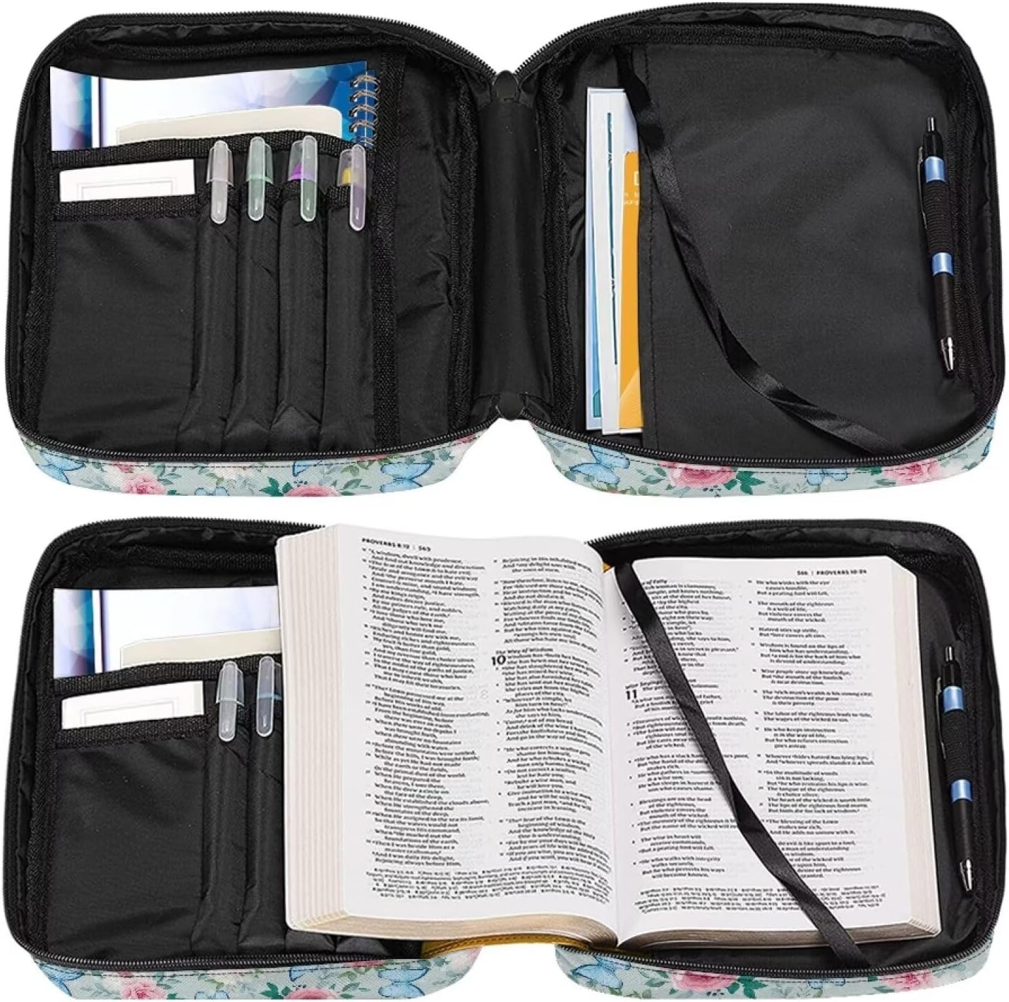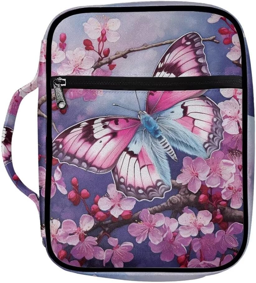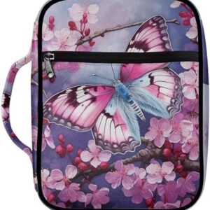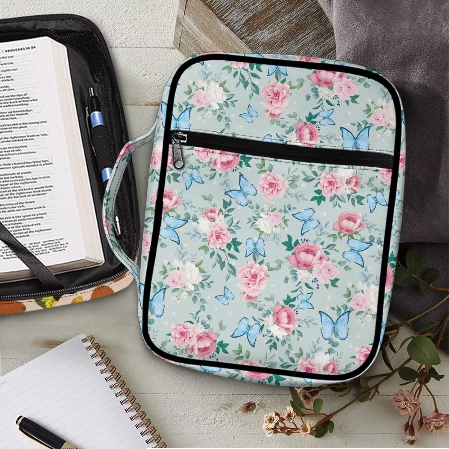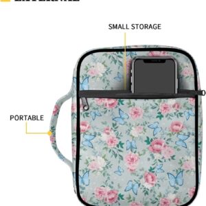 Coldinair Pink Rose Print Bible Covers for Women Blue Butterfly Carrying Book Case Church Bag Bible Protective with Bookmark with Zippered Pocket Church Bag Bible Protective Handbag